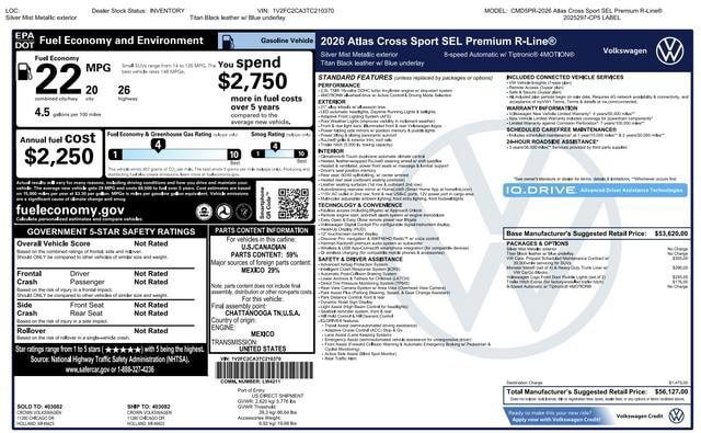 This stunning 2026 Volkswagen Atlas Cross Sport 2.0T SEL Premium R-Line AWD is a true standout in the midsize SUV segment. With its sleek and modern exterior design, this vehicle commands attention wherever it goes. Under the hood, you'll find a powerful 2.0L TSI engine mated to an 8-Speed Automatic with Tiptronic transmission, providing a thrilling and responsive driving experience.